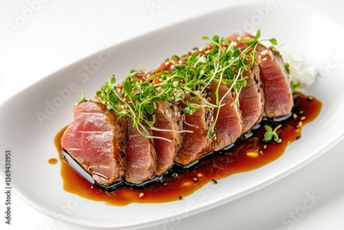 A premium donburi featuring seared tuna tataki, drizzled with ponzu sauce and microgreens, high detail, white background.