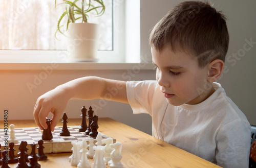 A preschool boy arranges pieces on a chessboard for playing chess. Board games.