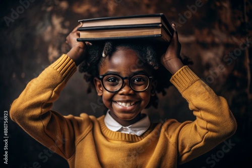 A pretty black African American girl with glasses and books in her hands. The child goes to school for the first time.A child in the classroom on the background of a blackboard. Back to school.