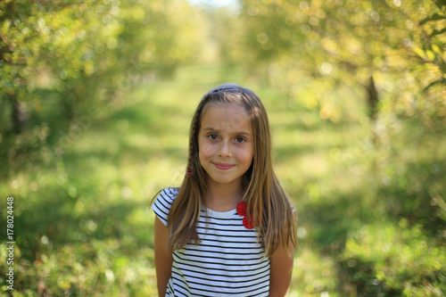 A Pretty Girl Smiles In A Sunny Autumn Apple Orchard