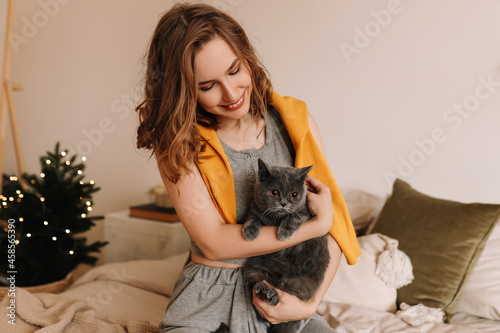 A pretty smiling young woman in pajamas hugs her friend's pet domestic cat sitting in a cozy bedroom decorated with Christmas decor at home, selective focus