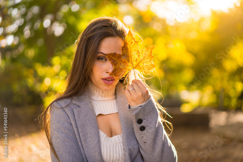 A pretty woman enjoying autumn in a park at sunset, with a leaf from the tree