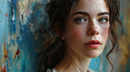 A Pretty Young Girl Blue Grunge Rough Textured Wall On Blurry Background