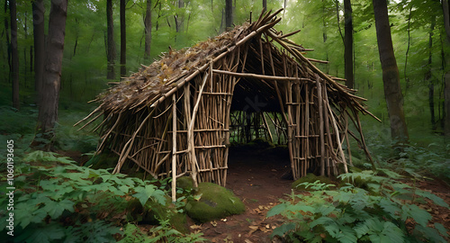 A primitive shelter built from branches, leaves, and animal skins, nestled in a secluded forest clearing. It appears sturdy and functional, suggesting early human settlement.