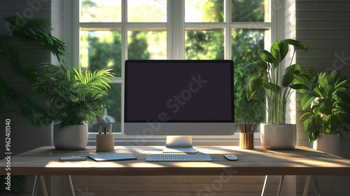 A pristine desk featuring a sleek, modern desktop computer with a blank screen, ideal for graphic design mockups, presentations, or showcasing portfolio and website designs