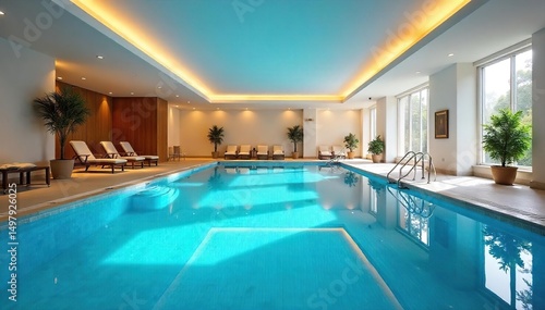 A pristine indoor swimming pool, sparkling blue water reflecting the overhead lights, clean and modern design, inviting atmosphere for relaxation and exercise , clean, fitness, design