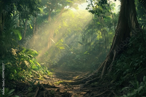 A pristine, untouched rainforest with dense, lush trees and vibrant foliage. Sunlight filters through the canopy, casting dappled light on the rich, vibrant ecosystem below.