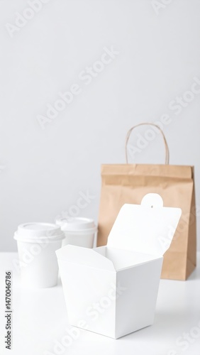 A pristine white box sits on a wooden surface, accompanied by two elegant ceramic cups and a neatly folded paper bag, suggesting a delightful gift.