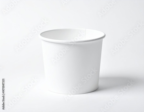 A pristine white ceramic cup rests elegantly on a polished wooden table, reflecting soft natural light that enhances its smooth surface and subtle shadows.
