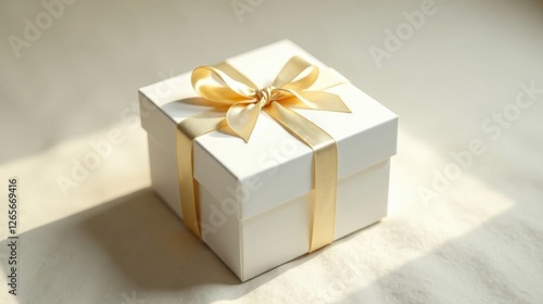 A pristine white gift box adorned with a delicate golden ribbon, bathed in soft sunlight, awaits a special occasion.