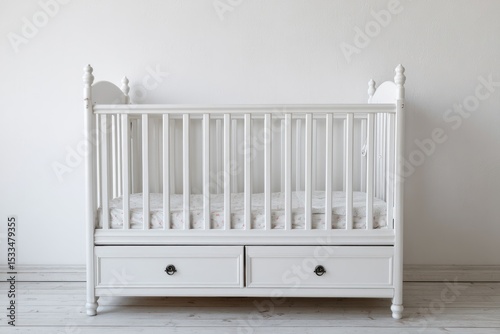 A pristine white wooden crib with two drawers sits against a plain white wall, ready for a baby