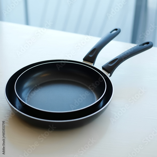A product photo of two black non-stick frying pans stacked on top of each other against a pure white background.