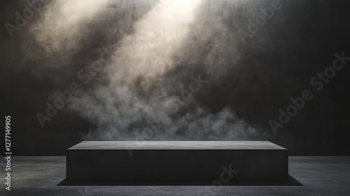 A product showcase set against a black studio backdrop, illuminated by a spotlight. This blank concrete wall and floating smoke effect create a dramatic setting for product displays or montages