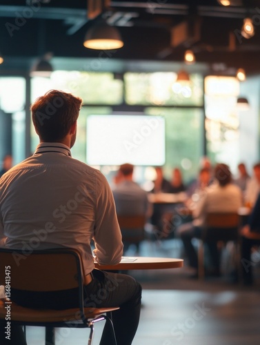 A professional business man preparing for a presentation at a modern boardroom or seminar. He is dressed in formal attire and sits behind a podium with microphone ready to speak.