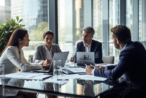 A professional business meeting with executives gathered around a conference table, discussing strategies Generative AI