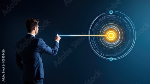 A professional businessman showing a virtual target board, representing business success, goal planning, and investment strategies, set against a calm light navy blue backdrop.