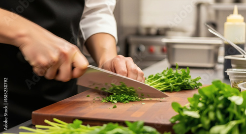 A professional chef carefully chops fresh green herbs on a wooden cutting board in a kitchen.