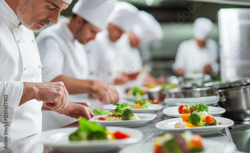 A professional chef in a commercial kitchen carefully plating a fresh vegetable dish with precision and attention to detail.