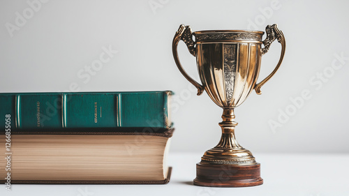 A professional close-up of a trophy with a book, emphasizing educational accomplishments.