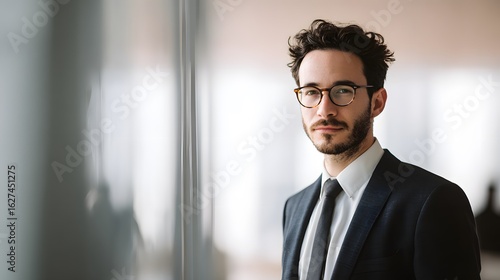 A professional consultant in formal attire, exuding confidence against a blurred office backdrop.