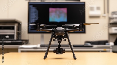 A professional drone with a mounted camera is displayed on a table in a modern office or lab setting, with a monitor in the background.