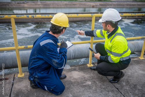 A professional engineer and technician are working together to seriously check the water quality in a water treatment pond.
