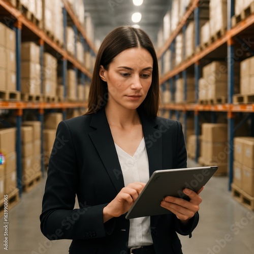 A professional European woman in a formal blazer holds a tablet in a warehouse with tall shelves of boxes, softly lit for a focused, tech-savvy atmosphere.