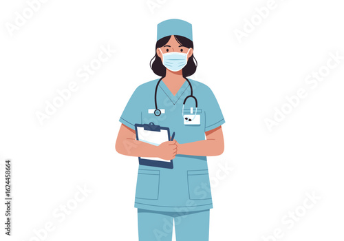 A professional female doctor or nurse in scrubs and a face mask, holding a clipboard for patient consultation. Vector character illustration.