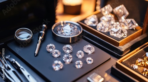 A professional gem appraisers desk with loose diamonds and magnifying tools