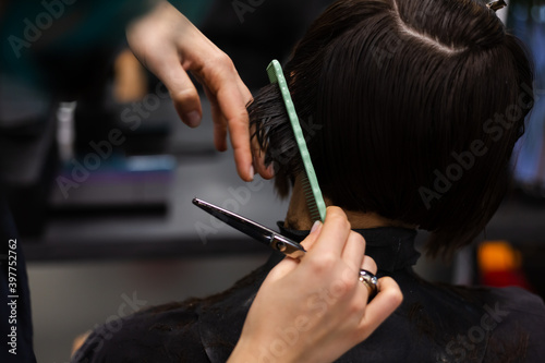 A professional girl hairdresser in face mask makes a client trendy stylish short hair cut. The girl is sitting in stylish beauty salon. Social distance. Protective measures.