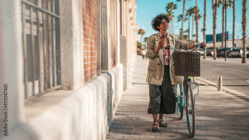 A professional Hispanic woman enjoys her morning coffee while walking beside her bicycle, ready for the commute, embracing sustainable transportation in an urban setting.