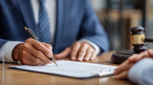 A professional in a suit carefully signs a legal document while seated at a table, with a gavel positioned nearby, indicating a formal discussion
