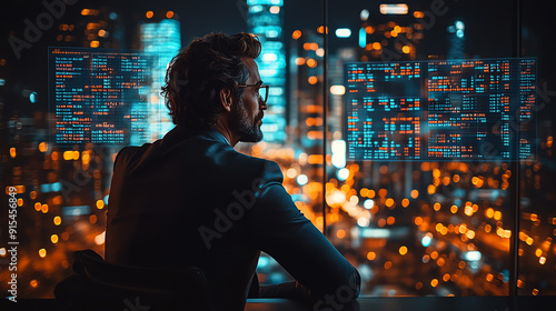 A professional man gazing at city skyline with digital data overlays, representing technology, innovation, and modern lifestyle.