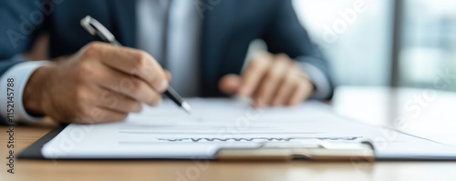A professional man in a suit signs a document on a clipboard, emphasizing business, commitment, and attention to detail in a modern office setting.