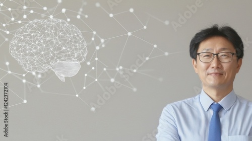 A professional man stands confidently in front of a stylized brain graphic, symbolizing intelligence and innovation in neuroscience.