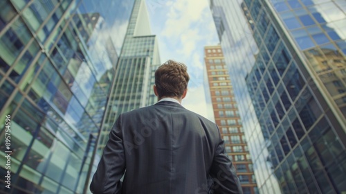 A professional man walking through a modern urban business district, dressed in a suit and tie.