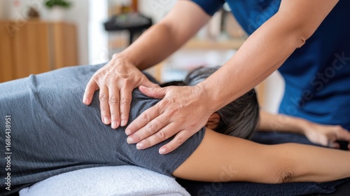 A professional massage therapy session showcasing a therapist's hands working on a client's back, highlighting relaxation and wellness in a soothing environment.