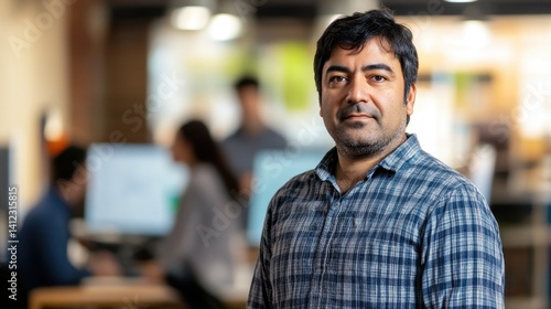 A professional middle-aged South Asian male stands confidently in an office environment, showcasing a blend of casual and smart attire, reflective of an IT profession.