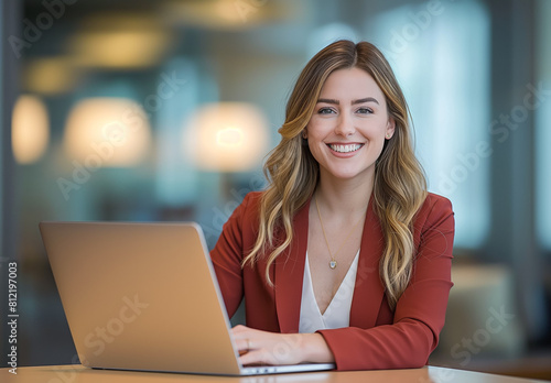 A professional photo of an attractive female digital marketing manager or real estate agent smiling at the camera while sitting in front of her laptop with a modern office background.