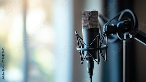 A professional podcasting setup featuring a microphone on a stand, with a clean white background.