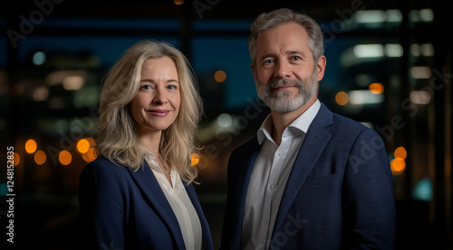 A professional portrait of two middle-aged, heavyset business people: a woman with blonde hair and a man with a short, grey beard, both wearing suit pants, a white shirt, and a nav