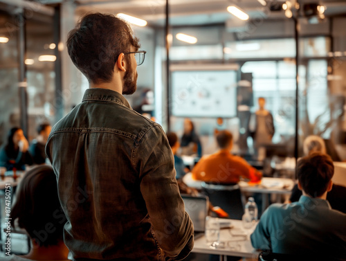 A professional seminar session in a bright room, a man in denim observing, blurred presenter and audience in the background, concept of corporate learning. Generative AI