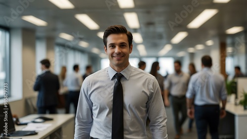 A professional walking through a busy office environment.