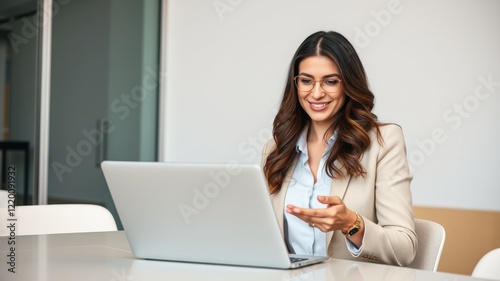 A professional woman smiles while using a laptop in a modern office setting, showcasing a positive work environment.