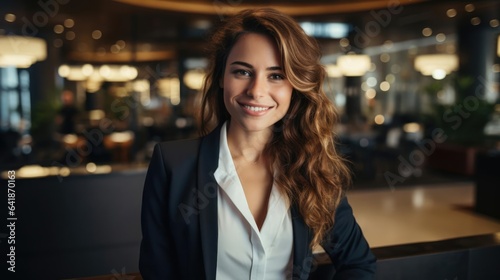 a professional woman smiling in business clothes in a modern concierge office with luxury details in the architecture