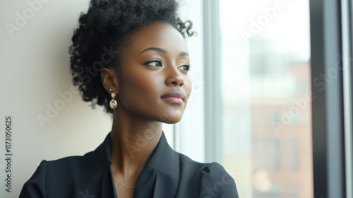 A professional woman with a focused look, standing near a window with soft natural lighting streaming in, reflecting determination