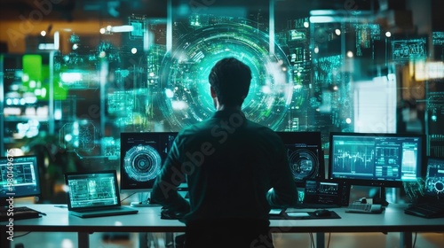 A professional working on advanced technology interfaces, showcasing data and analytics in a modern workspace.