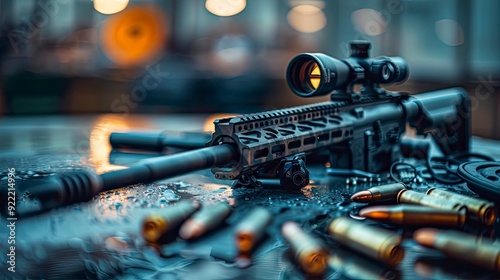 A professional-grade image of a tactical rifle lying on a range table, surrounded by accessories like a scope, tactical flashlight, and ammunition, with a blurred target in the background