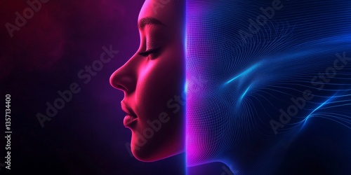 a profile of a woman's face glowing in pink and blue lights, with a dynamic wave effect on her right side
