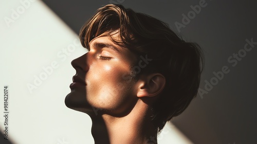 A profile of a young man illuminated by soft sunlight, creating striking shadows on his face, conveying peace and serenity.